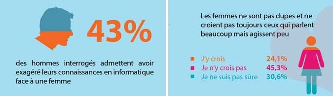 Problème : ces dames ont souvent des doutes sur les compétences de ces messieurs en la matière. 45,3 % d’entre elles ne croient pas ceux qui parlent beaucoup mais agissent peu. Et elles n’ont finalement pas tort puisque 43 % des hommes interrogés admettent avoir exagéré leurs connaissances en informatique face à une femme. Ce que confirme la sociologue Christine Castelain-Meunier : « les femmes reprochent aux hommes de manquer de fiabilité quand elles font appel à eux en informatique et qu’ils se livrent à de la surenchère. Alors qu’en améliorant leurs connaissances ils consolideraient la relation en rétablissant une confiance souvent mise à mal. »
