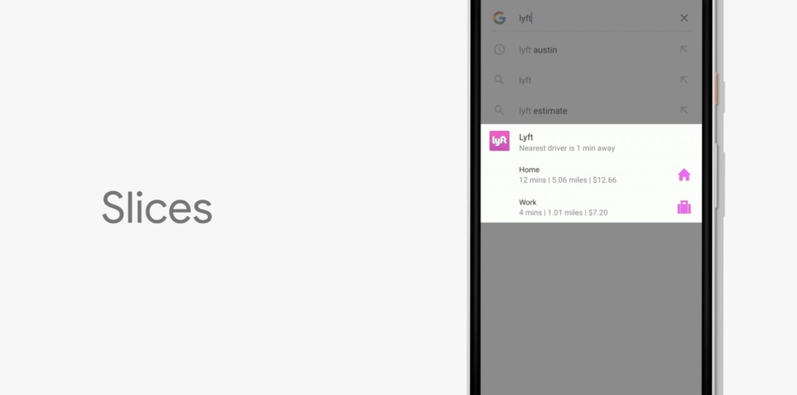Android P ajoute aussi un système baptisé Slices, qui permet depuis la recherche de Google d’effectuer des actions rapides. Par exemple, si vous cherchez « Google Maps », Android vous proposera de lancer un trajet vers votre domicile ou votre restaurant préféré directement dans les résultats de recherche. Les développeurs ont la possibilité d’intégrer Slices à leurs applications pour être prêts au lancement d’Android P cet automne.