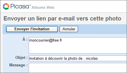 Votre album est prêt : vous pouvez désormais inviter vos amis à le découvrir. Un simple navigateur Internet leur suffira. Picasa Album Web offre une fonction de messagerie qui crée automatiquement de superbes courriers