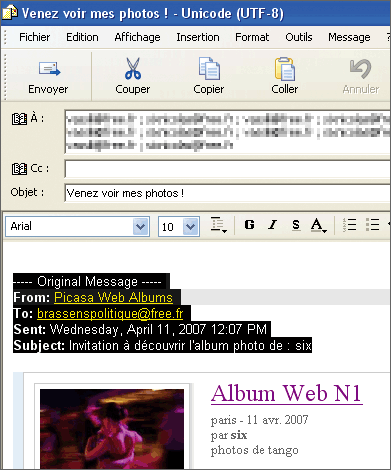 Lancez votre logiciel de messagerie et ouvrez le message que vous avez reçu de Picasa Albums Web. Cliquez sur Transférer. Dans le champ A:, entrez les adresses de vos amis (ou récupérez-les dans votre