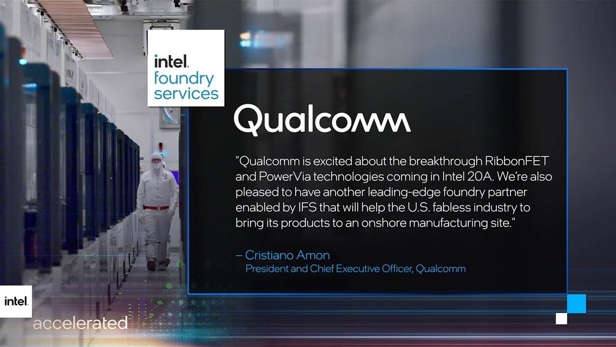L’autre gros client annoncé est Qualcomm. Le champion mondial des puces tout-en-un (SoC) pour smartphones sera le premier à profiter de la technologie « Intel 20A ». Un procédé qui unit non seulement un usage massif de la gravure EUV, mais aussi les nouveaux transistors de type RibbonFET et la structure d’alimentation par le dessous de la puce appelée PowerVia.