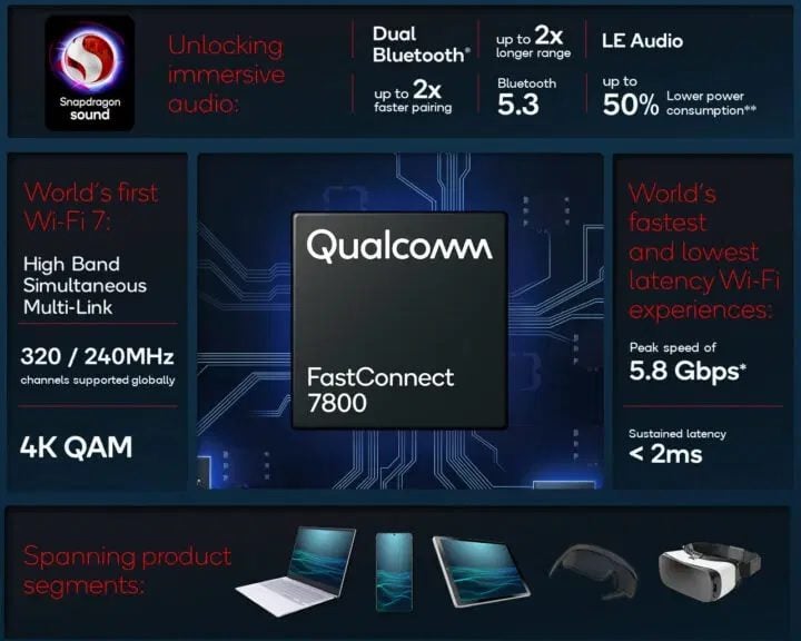 Toutefois, le problème reste d’établir la meilleure transmission Bluetooth entre l’appareil mobile et le périphérique audio. C’est pour cela que Qualcomm propose des composants pour les deux types d’appareils. Ainsi, le constructeur a dévoilé au MWC 2022 sa solution FastConnect 7800, qui dispose du Wi-Fi 7 (802.11be), du Bluetooth 5.3 et de la plate-forme Snapdragon Sound avec le codec aptX Lossless.