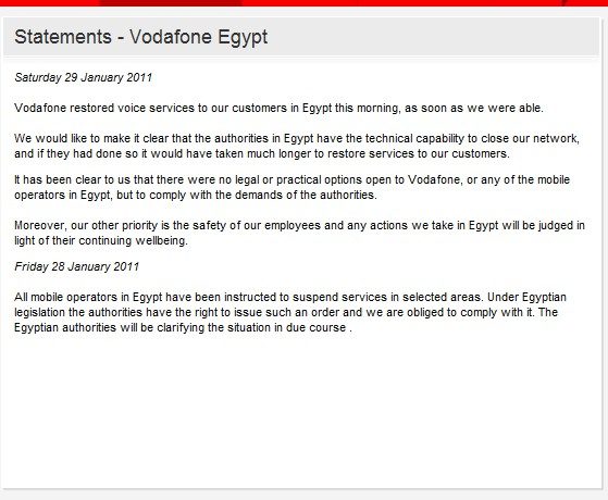 « Ces messages ne sont pas rédigés par les opérateurs de téléphonie mobile, et nous ne disposons d’aucun droit de regard face aux autorités concernant leur contenu », insiste le groupe, qui affirme avoir protesté auprès du gouvernement. « Nous avons fait savoir que tous les messages devaient être transparents et que leur expéditeur devait être clairement identifiable. » En effet, rien ne précisait que les autorités égyptiennes étaient à l’origine des SMS envoyés. Selon l’agence Reuters, l’un d’eux communiquait le lieu et l’heure d’une manifestation favorable à Hosni Moubarak.