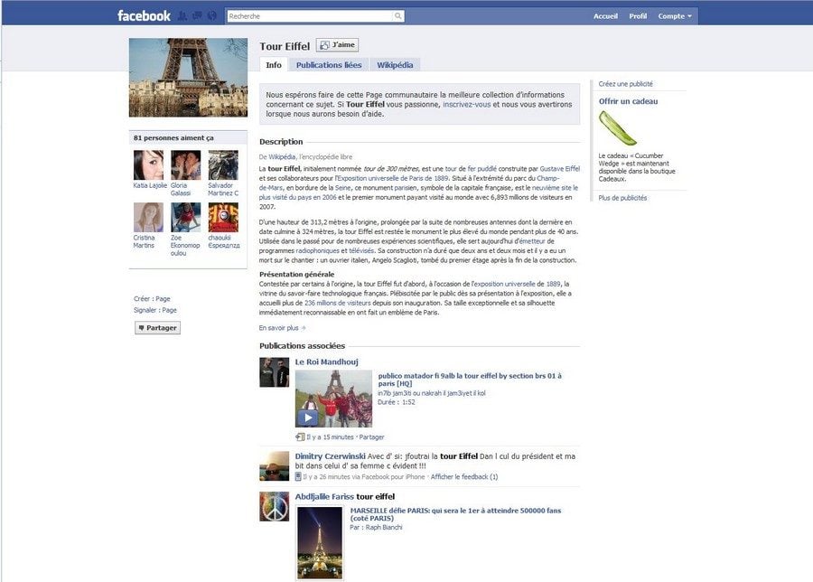 Le site regroupe sur une même page les membres qui ont un centre d’intérêt commun. Facebook crée ce type de groupe à partir des contenus que vous publiez sur votre mur (voir l’exemple de « tour Eiffel » dans la capture ci-dessus). Ainsi, vous pourriez vous retrouver épinglé sur une page communautaire sans même le savoir, indique l’EFF.