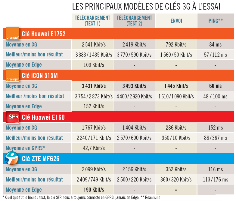 Pas question pour nous d’élire un trophée du « meilleur opérateur » : nous constatons simplement que nous avons obtenu de meilleurs résultats chez Orange. Et encore, tout dépend de la clé 3G utilisée : en moyenne, les vitesses de connexion se sont avérées supérieures avec la clé iCON 515M qu’avec la Huawei E1752.