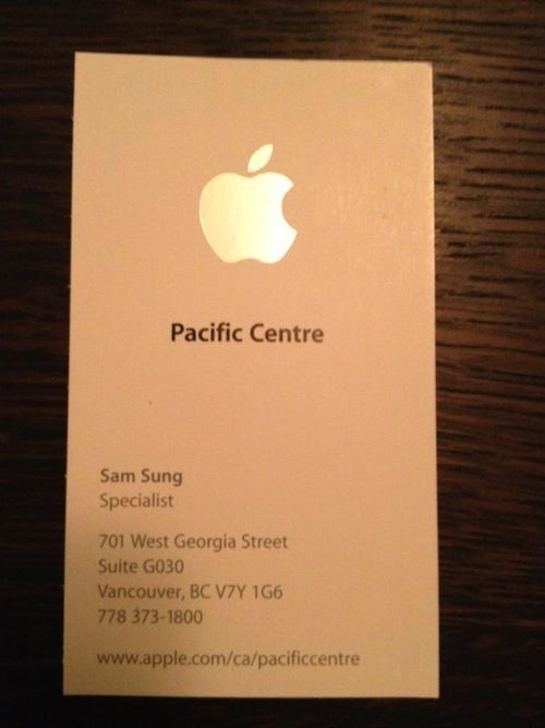Sam Sung travaillerait au Canada dans un Apple Store de Vancouver. Nous avons appelé la boutique, dont le numéro est sur la carte de visite, mais personne ne répond au téléphone. Après l’annonce de cette anecdote, des milliers de personnes ont dû appeler le magasin pour parler à ce M. Sung.