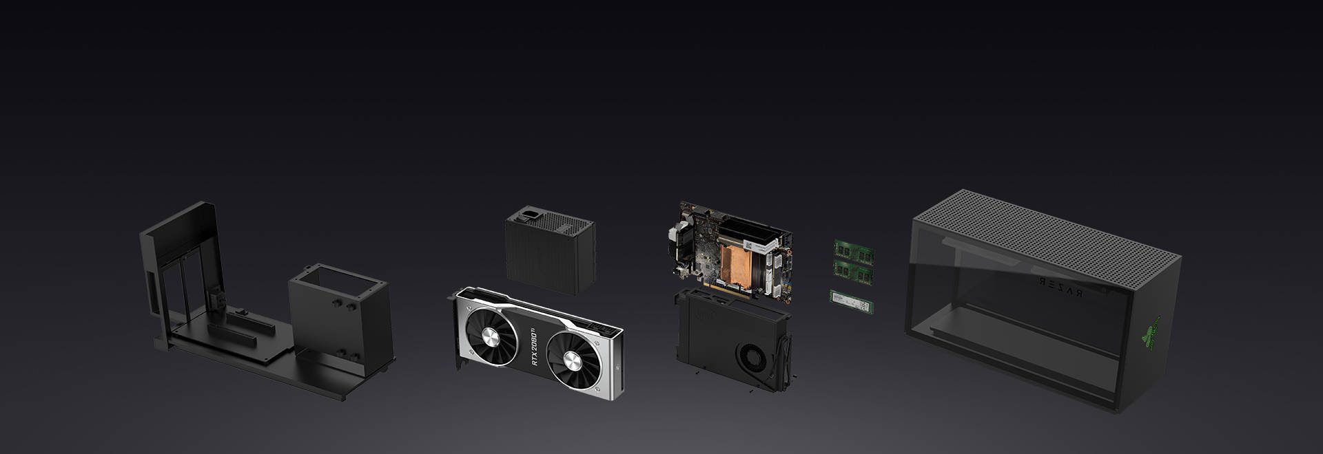 C’est un boîtier qui reprend beaucoup d’ingrédients de ceux utilisés pour confectionner le Razer Core, sa boîte pour carte graphique externe. Le système d’ouverture a toutefois été repensé : c’est un plateau coulissant vers l’arrière pour faciliter l’installation des composants. On trouve aussi deux gros ventilateurs sur la paroi supérieure pour évacuer toutes les calories que générera tout ce petit monde.