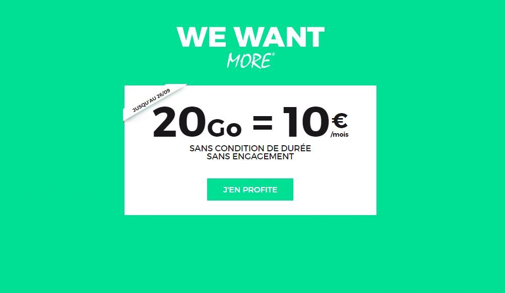 Red By SFR réitère le principe d’une promotion choc valable à vie mais à saisir durant quelques jours seulement. Lancée une première fois au mois de juillet dernier, son offre de 20 Go de data à 10 euros est proposée jusqu’au 26 septembre sur le même principe.