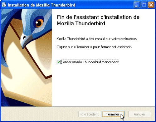1 – Une fois le fichier d’installation récupéré au complet sur votre ordinateur, double-cliquez sur son icône pour lancer l’installation. Un assistant s’affiche alors. Acceptez les conditions de licence, optez pour une installation Standard, Thunderbird s’installe rapidement. Cliquez sur Terminer et laissez la case Lancer Mozilla Thunderbird maintenant cochée.