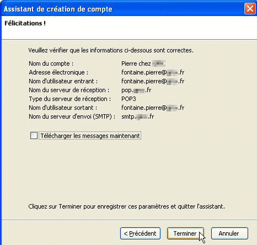 7 ?” Vous avez configuré votre compte de messagerie. Thunderbird récapitule les informations saisies pour vous permettre le cas échéant d’apporter des modifications. Après vérification, décochez la case Télécharger les messages maintenant, puis cliquez sur Terminer.