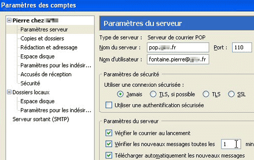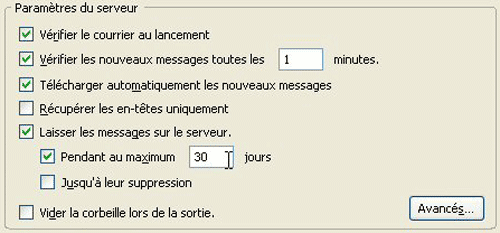9 ?” Sous l’appellation donnée à votre compte (Robert chez FAI), cliquez sur Paramètres serveur. Vous allez d’abord régler la fréquence de vérification. Dans la sous-rubrique Paramètres du serveur, assurez-vous que la case Vérifier les nouveaux messages toutes les XX minutes soit cochée. Puis définissez un laps de temps qui vous convient. Si vous recevez beaucoup de mails, une ou deux minutes peuvent être un bon choix.