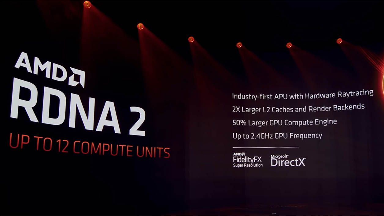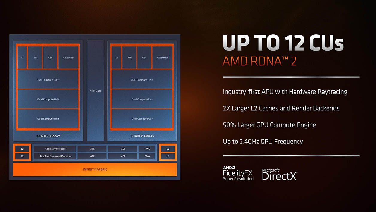 Ce qui fait briller nos yeux c’est qu’on passe de jusqu’à six cœurs Vega à 12 cœurs RDNA 2, la plus grosse puce intégrée jamais produite pas AMD. Et la plus puissante : deux fois plus de mémoire cache, deux fois plus de performances de rasterization, etc.