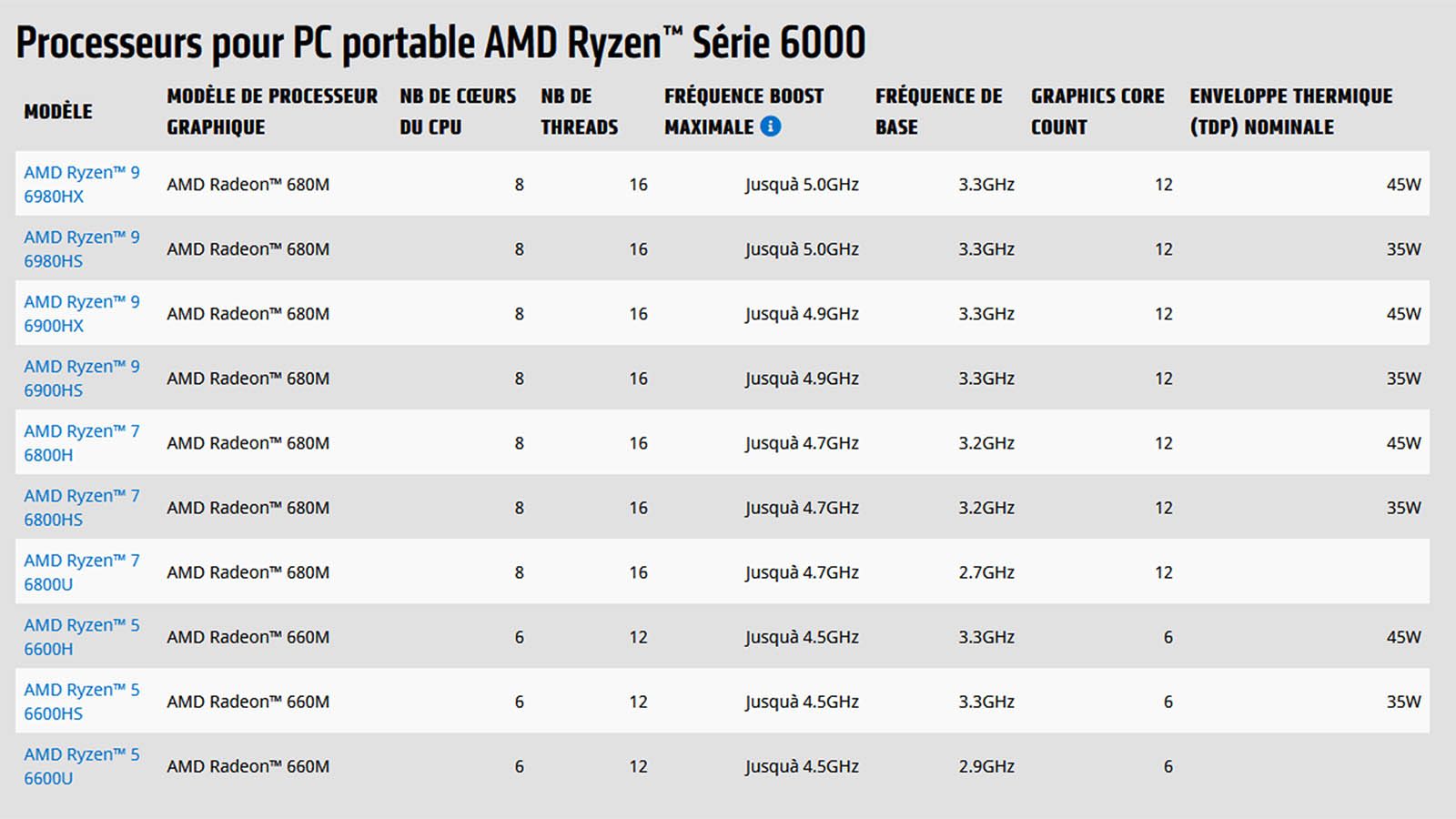 Quand tous les Ryzen 4000/5000 affichaient « AMD Radeon Graphics » sans plus de détails, laissant aux curieux et aux geeks le soin d’aller lire la fiche technique sur amd.com, les puces en RNDA2 s’appellent AMD Radeon 660M (six cœurs graphiques) et AMD Radeon 680M (12 cœurs graphiques).