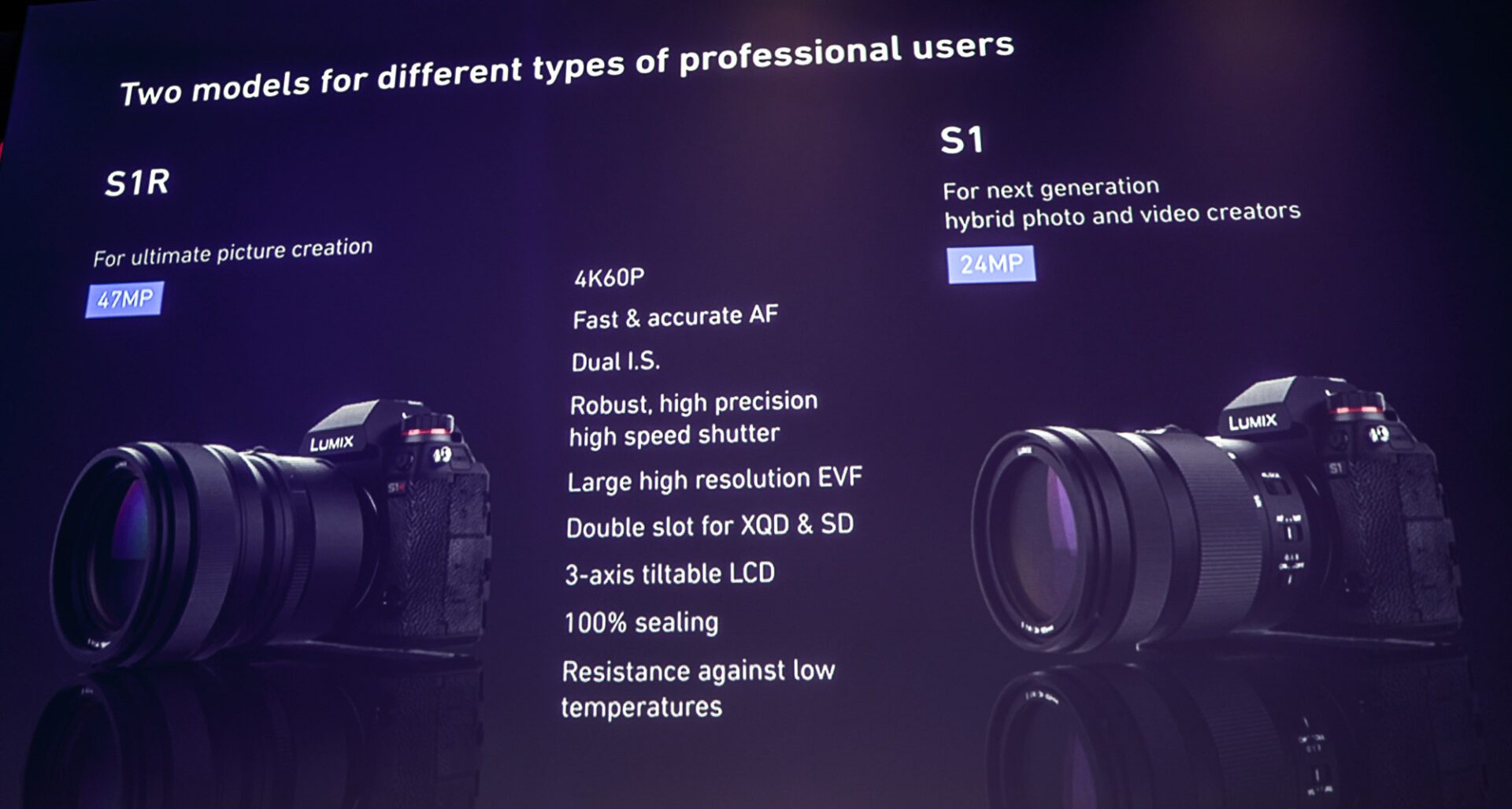 A la manière de Nikon avec ses Z6 et Z7, les deux boîtiers de Panasonic seront différenciés uniquement par le capteur : pour le S1, un capteur plein format de 24 Mpix et un gros méchant capteur de 47 Mpix pour le S1R – où le R signifie, comme chez Sony, « Resolution » (définition d’image en français). Mis à part ce composant, ils sont strictement identiques.