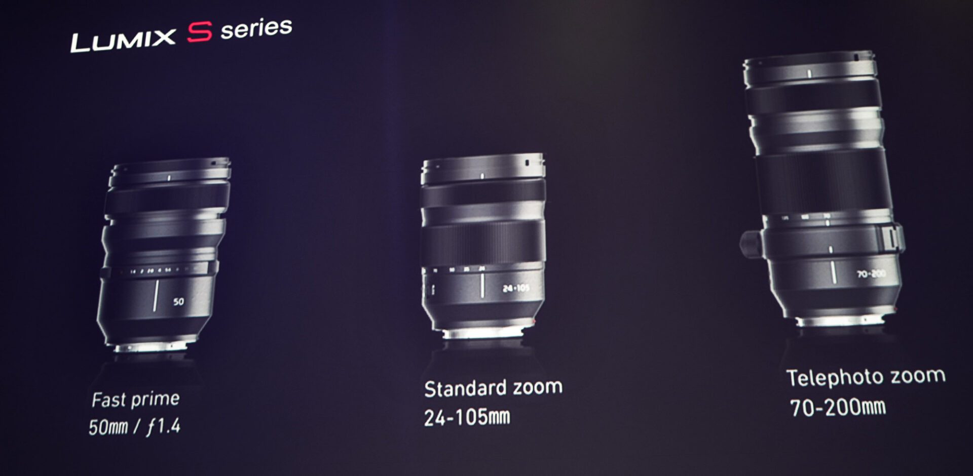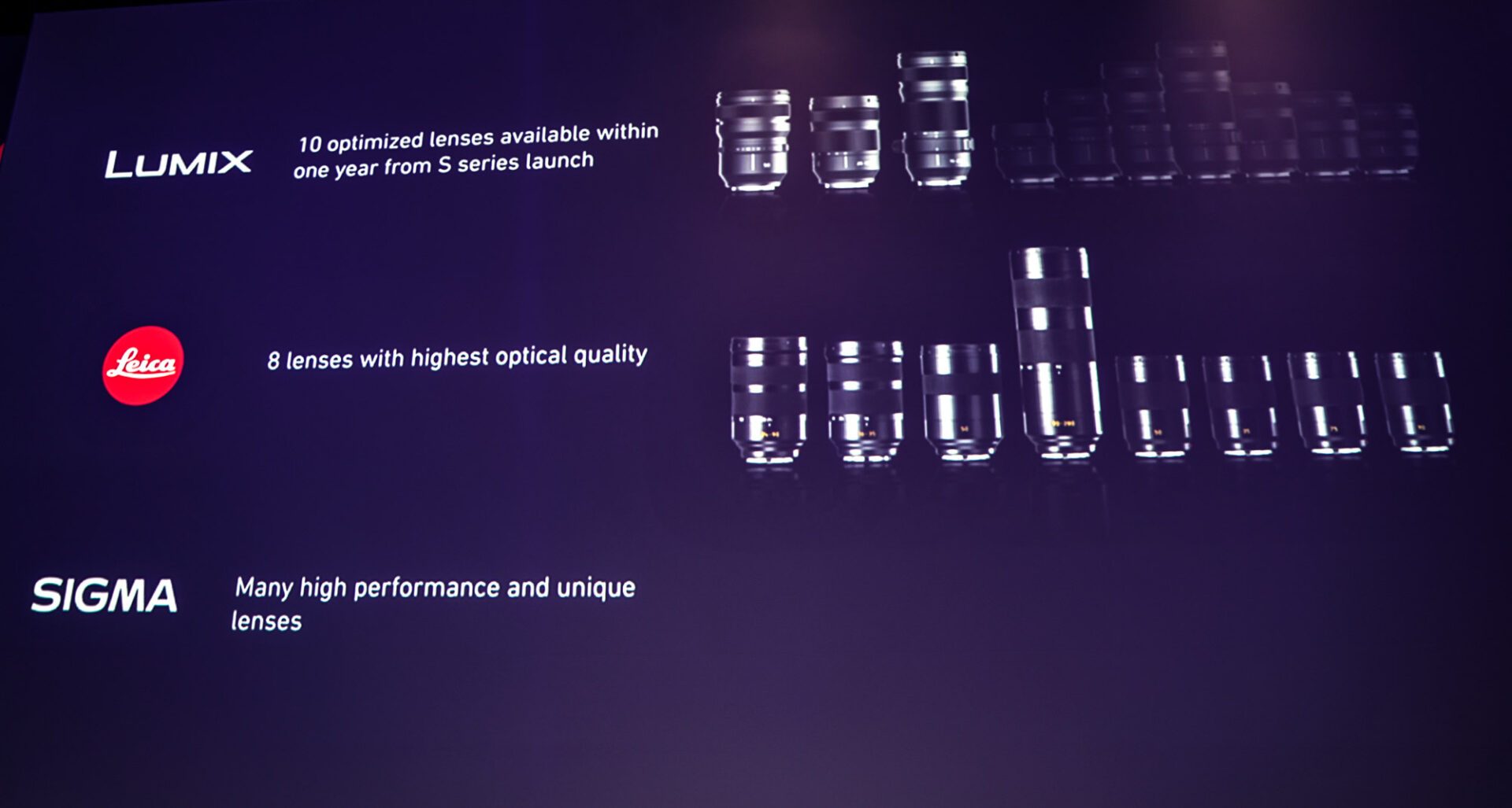 Outre les six optiques SL déjà disponibles chez Leica (deux de plus en 2019 et 3 de plus en 2020) et celles que Sigma, partenaire de la monture, devrait annoncer, Panasonic annonce trois optiques au lancement : un 50 mm f/1.4, un 24-105 mm (f/ non communiqué) et un 70-200 mm (f/ non communiqué).