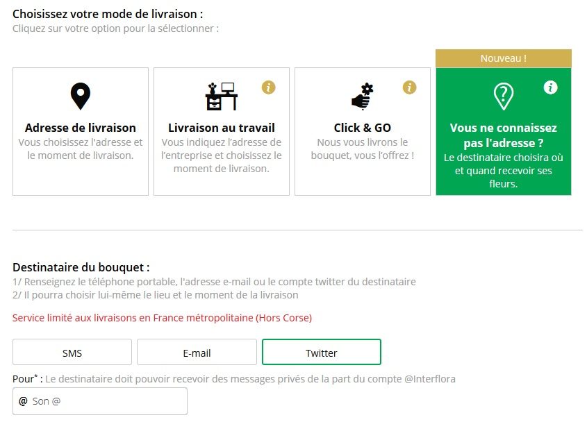 Pour la Saint-Valentin, vous avez décidé d’offrir des fleurs à votre bien-aimé(e) mais vous ne connaissez pas précisément son adresse ? Tout n’est pas perdu et Interflora, le célèbre fleuriste, a prévu une solution sur son site Web. Quand vous passez la commande, vous pouvez choisir l’option « Vous ne connaissez par l’adresse » et demander à ce qu’Interflora contacte le ou la destinataire par Twitter, à condition qu’il/elle accepte les messages privés.
