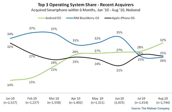Le secret d’un tel succès tient en un mot : Android, l’OS de Google, qui équipe le Galaxy S. Hier encore, le cabinet d’études Nielsen a publié des chiffres qui confirment une tendance que nous évoquions déjà voici quelques semaines : Android est toujours le plus populaire des OS parmi les acquéreurs récents de smartphones aux Etats-Unis (32 % des téléphones vendus contre 25 % pour iOS). Et ce, malgré le lancement récent de l’iPhone 4, à la fin de juin. Android progresse toujours à grands pas, et est passé, toujours d’après Nielsen, à 8 % de parts de marché en janvier 2010 à 19 % en août aux Etats-Unis.