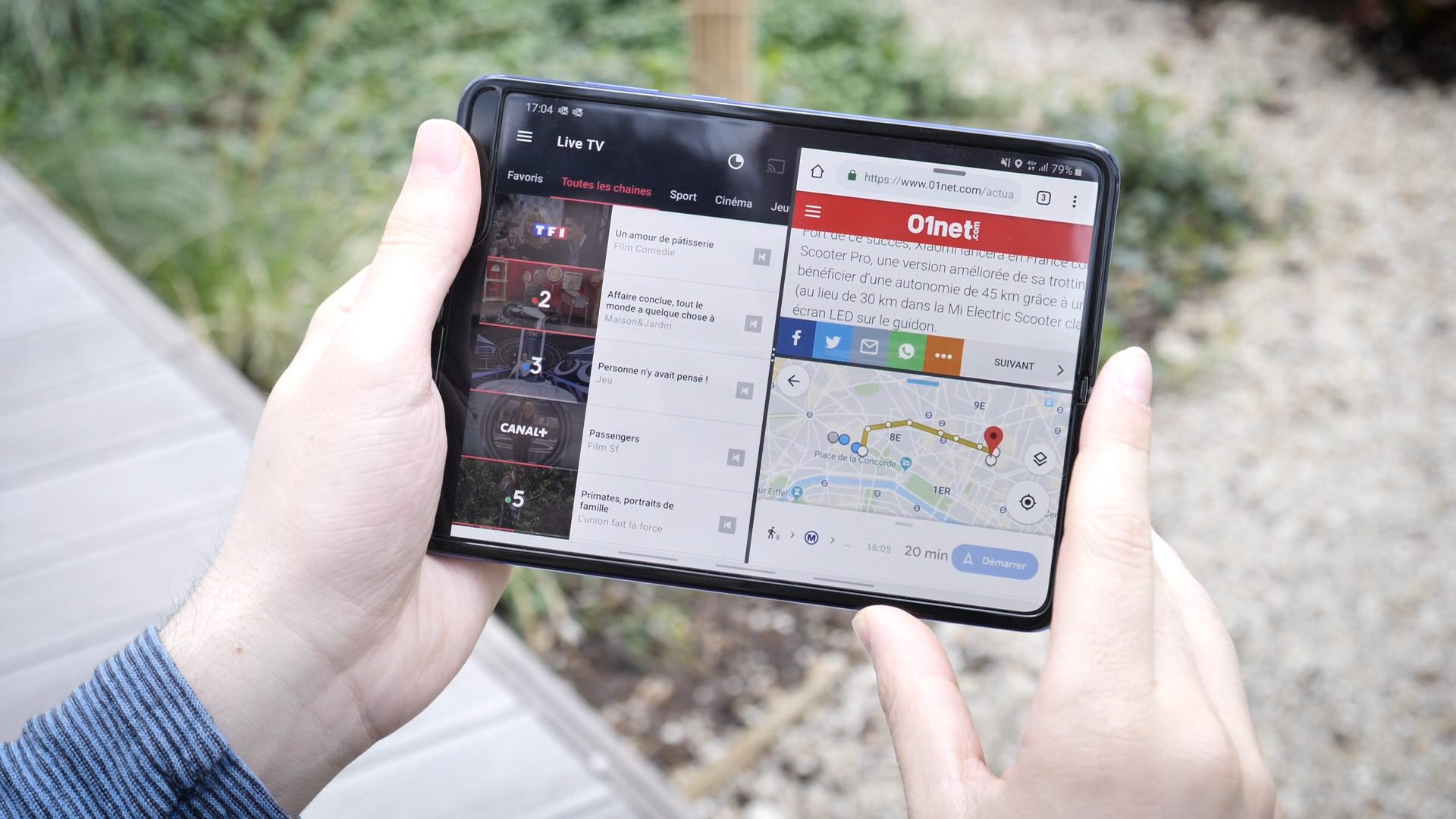 Le système d’exploitation du Galaxy Fold nous a positivement surpris. Très facilement, on peut utiliser deux ou trois applications simultanément. Il suffit de faire un geste vers la gauche en partant de la droite de l’écran et de sélectionner une appli. Ce système nous semble suffisamment ergonomique pour être compréhensible… même si tout le monde n’y arrive pas du premier coup. Au bout de quelques manipulations, ça devient en revanche naturel.