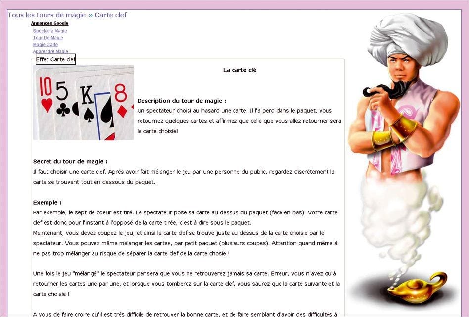 apprendre.magie.free.fr‘ De magiques tours tu trouveras, chercher tu dois, et le secret du tour se dévoilera. ‘ Voilà les indications que ce site fantaisiste vous invite à suivre pour pénétrer les secrets