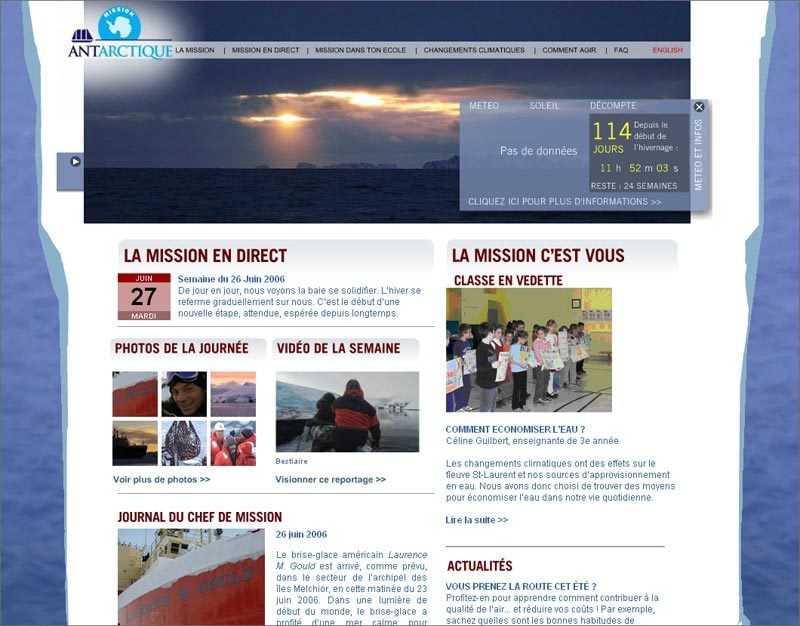 scientifique et cinématographique visant à nous sensibiliser aux enjeux des changements climatiques. Il faut savoir que le pôle Sud est l’endroit qui s’est le plus réchauffé au cours des dernières décennies. Le site permet de visiter le bateau et de
