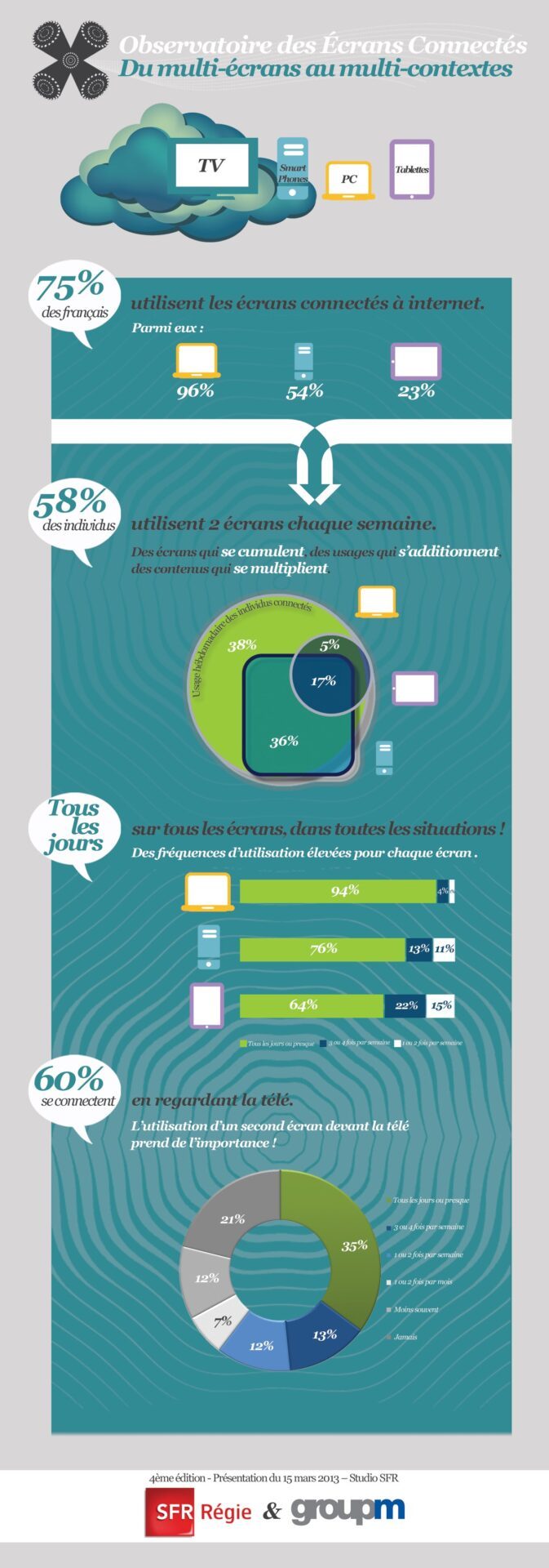 En août 2012, Google estimait à l’issue d’une étude que les Américains passaient plus de 4 heures par jour à interagir sur plusieurs écrans (PDF). Ce comportement tend à s’étendre. Ainsi SFR et GroupM, société de conseil, viennent de rendre publics les résultats d’une enquête sur ce phénomène dans l’Hexagone. On y apprend notamment que 58 % des internautes, âgés de 16 à 65 ans, utilisent au moins deux écrans chaque semaine.
