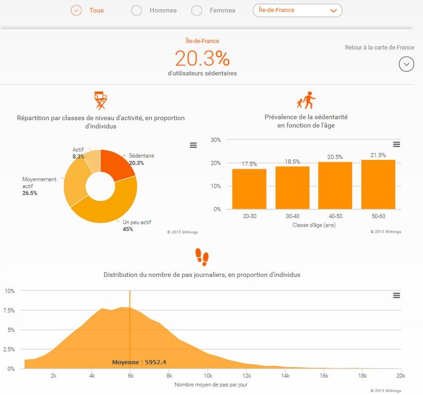 Après avoir dressé une carte de l’obésité en France il y a un an, Withings, entreprise spécialisée dans les objets connectés, lance ce 9 février 2015 un Observatoire de l’activité physique en France, basé sur les données fournies par 100 000 utilisateurs de ses bracelets connectés, à des fins de santé publique.