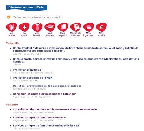 Service-public.fr. Plus de 600 démarches et téléservices (formulaires à télécharger) y sont répertoriés, pour près de 50 institutions et organismes publics. L’interface, minimaliste,