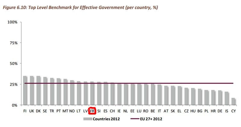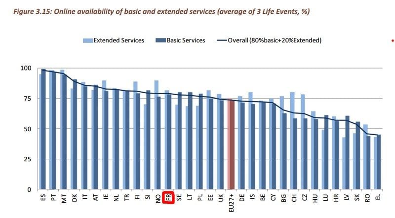 Plus en détail, l’Hexagone arrive en 13ème position au niveau de la disponibilité des services et en 11ème position au niveau de l’efficacité générale des services. La France se distingue, en particulier, au niveau de l’implémentation de l’authentification centralisée (SSO), de la sauvegarde de documents en ligne (eSafe), de la gestion des données personnelles (score de transparence 75/100 contre 43/100 en moyenne pour l’Europe) et des services en ligne concernant la recherche d’emploi (score de performance technique 93/100 contre 73/100 en moyenne pour l’Europe).