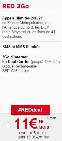 SFR repasse à l’offensive sur les prix de ses forfaits mobiles sans engagement. Son offre Red à 3 Go d’Internet mobile voit son prix baisser de 19,99 euros à 11,99 euros, soit – 40 % !