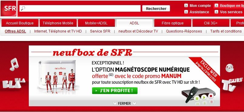SFR propose, dans le cadre d’une offre exceptionnelle, la gratuité du service de magnétoscope numérique pour toute souscription à une offre triple play Neufbox.