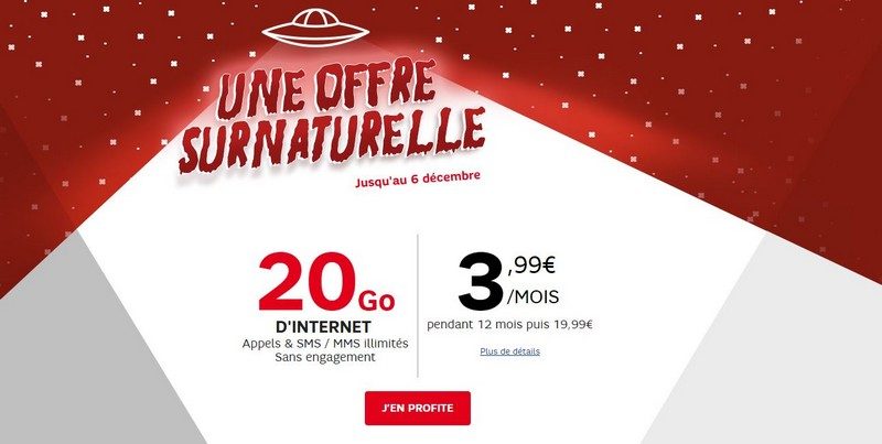 La guerre de la 4G aura bien lieu. Nous évoquions ce matin la traditionnelle promotion de Free Mobile sur le site vente privée qui propose jusqu’au 7 décembre son forfait 50 Go à 3,99 euros par mois durant un an. Red by SFR a aussitôt répliqué en alignant son offre 20 Go sur le même prix de 3,99 euros pendant 12 mois. Elle passe ensuite à 19,99 euros par mois.
