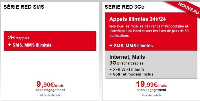 SFR vient de simplifier, à leur tour, ses offres d’abonnement sans engagement (disponible uniquement en ligne) en les réduisant de trois à deux. En fait, au lieu des offres existantes à 19,90 euros (500 Mo) et à 24,90 euros (1 Go), l’opérateur ne propose plus qu’une seule offre à 19,99 euros/mois avec un plafond mensuel de données fixé à 3 Go. Les applications de voix sur IP et le mode modem (partage de connexion) sont autorisés. L’autre formule Red est à 9,90 euros/mois pour 2 heures d’appels, SMS et MMS illimtés.