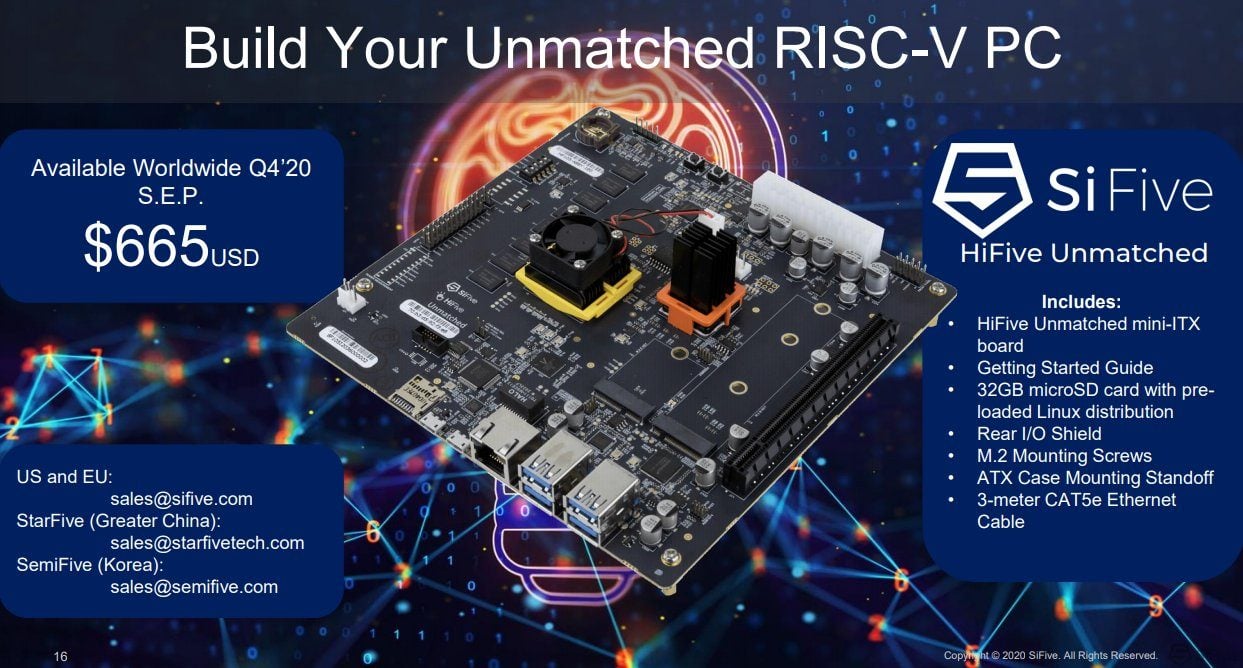 Mise à jour du 31/10/2020 : HiFive Unmatched sera disponible à l’achat d’ici la fin de l’année 2020. Son tarif américain est de 665$ sans taxes, ce qui devrait la placer aux alentours de 700 euros avec la TVA en Europe.