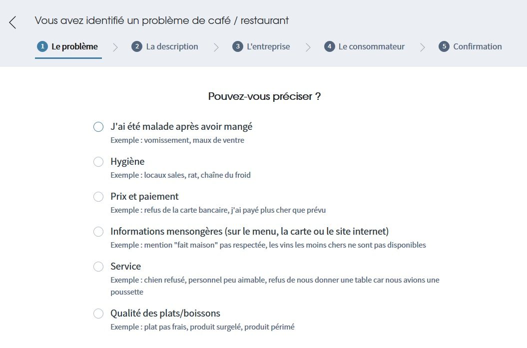 Le site web SignalConso a pour but de faciliter le signalement de problèmes rencontrés par les consommateurs avec des entreprises. Par exemple, vous pouvez indiquer un problème dans un café ou un restaurant avec un large choix de sujets : hygiène, tarifs, service, qualité et informations mensongères.