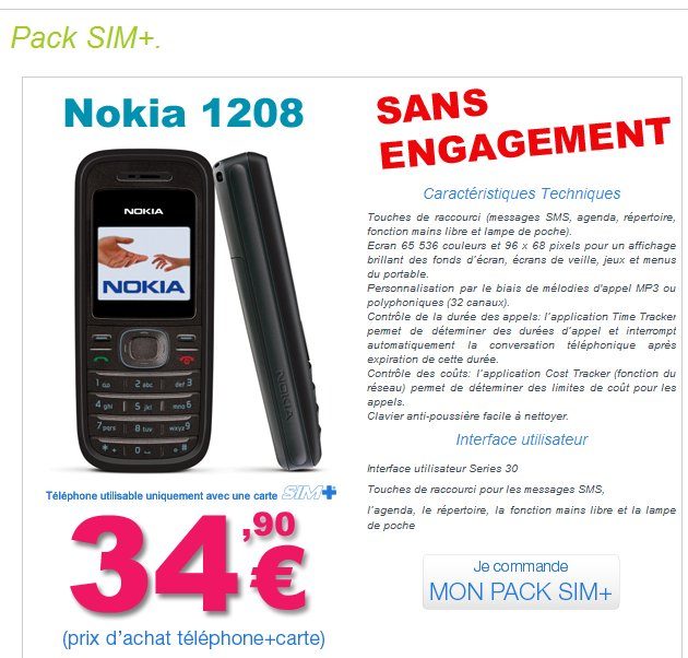 Pour accéder à ces services, il faut soit acheter une carte SIM à 9,90 euros, soit opter pour le pack à 34,90 euros contenant une carte SIM et un téléphone Nokia 1208.