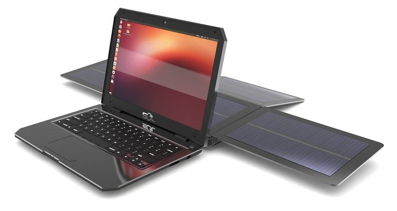 Doté d’un écran de 13,3 pouces affichant une résolution de 1 366 x 768 pixels, cet ordinateur renforcé tourne sous le système d’exploitation Ubuntu. Pour l’autonomie, le constructeur annonce environ dix heures d’autonomie, pour une recharge de deux heures grâce aux quatre panneaux photovoltaïques repliables situés à l’arrière du PC. Ils peuvent aussi être déportés pour une utilisation du Sol en intérieur.
