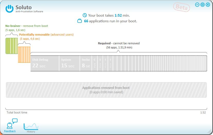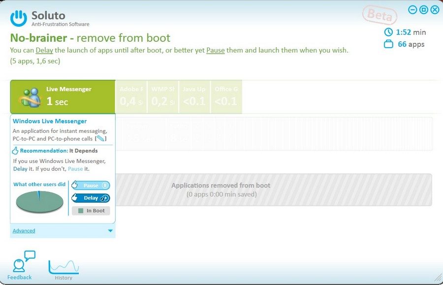 Les tests effectués ont montré l’efficacité du logiciel : il est parvenu à réduire d’environ 30 % le temps de chargement de leur Windows sans altérer la stabilité du système. Toujours en cours de développement, Soluto est proposé gratuitement dans une version bêta.