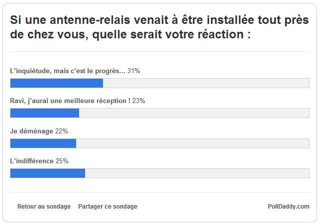 L’inquiétude domine chez 31,1 % d’entre vous et vous êtes 21,7 % à déclarer que vous déménageriez en cas d’installation d’une antenne-relais près de chez vous. La méfiance l’emporte donc avec un total de 52,8 %. L’indifférence ou la satisfaction (de bénéficier d’une meilleure couverture téléphonique) ne remporte que 47,2 % des suffrages. Bref, les effets de la téléphonie mobile sur la santé publique suscitent toujours la méfiance, même parmi un public technophile.