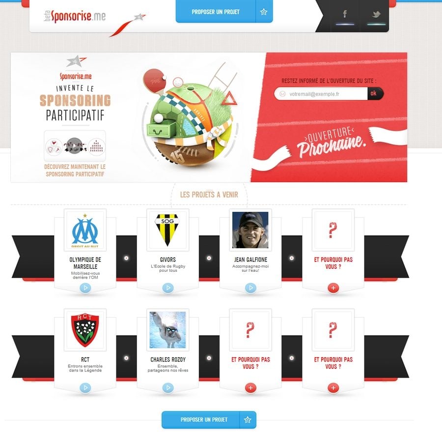 La publication d’un projet sportif est ouverte à tous et gratuite, mais pas automatique. Celui-ci devra d’abord être approuvé par un comité de sélection qui vérifiera s’il est réel et viable. Si c’est le cas, il restera en ligne pour une durée de 90 jours en moyenne. Cinq premiers projets sont déjà planifiés et mis en ligne dans les mois ou semaines à venir. L’Olympic de Marseille et le club de rugby amateur de Givors seront les premiers à dévoiler leurs projets, le 5 et le 16 mars. Ils seront suivi par le Rugby Club Toulonnais, l’athlète de la perche Jean Galfione, et le champion paralympique Charles Rozoy.