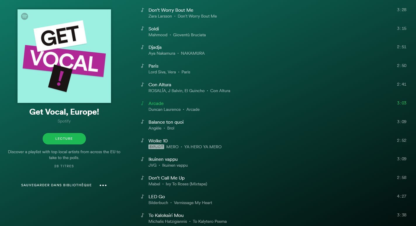 Connu pour ses playlists intelligentes, Spotify vient de sortir une liste musical d’un nouveau genre. « Get Vocal, Europe ! » dévoilée jeudi 9 mai, est composée de 28 morceaux, représentant chacun l’un des pays de l’Union Européenne (UE).