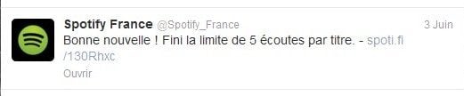 Le marché du streaming audio prend de l’importance. Le retour de Napster sur ce créneau en est la preuve. Pour continuer de séduire les internautes, Spotify avait ajouté une fonction Découvrir à son lecteur audio. Il vient d’annoncer sur son blog et son fil Twitter un changement majeur : la restriction de cinq écoutes gratuites par titre a été levée le 3 juin 2013.