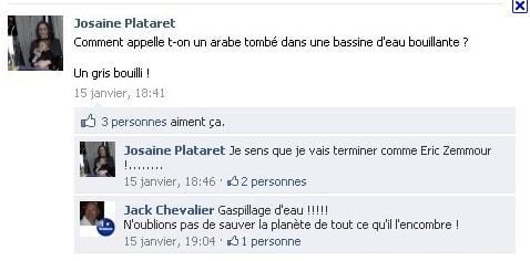 Face au tollé et aux multiples commentaires postés sur son mur après ses dérapages, Josaine Plataret a supprimé son profil du réseau social. Le compte de la candidate UMP était public. Reste à savoir si elle terminera, ainsi qu’elle l’a écrit elle-même, comme Eric Zemmour, à savoir devant les tribunaux. SOS-Racisme n’a pas tranché.