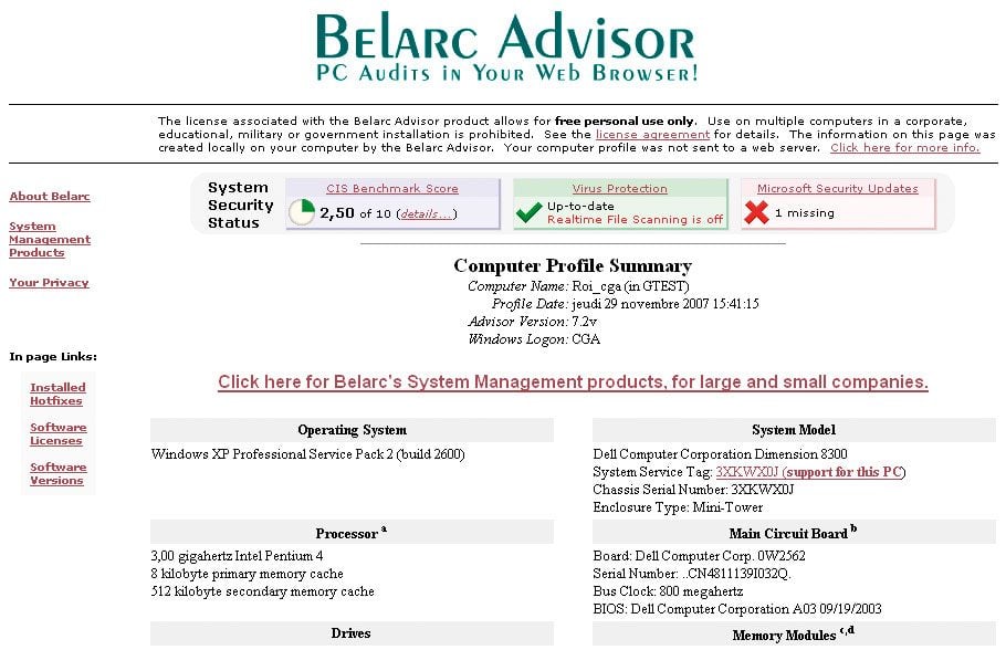 Belarc Advisor 7.2v (en anglais, XP et Vista) : un check-up pour votre PC