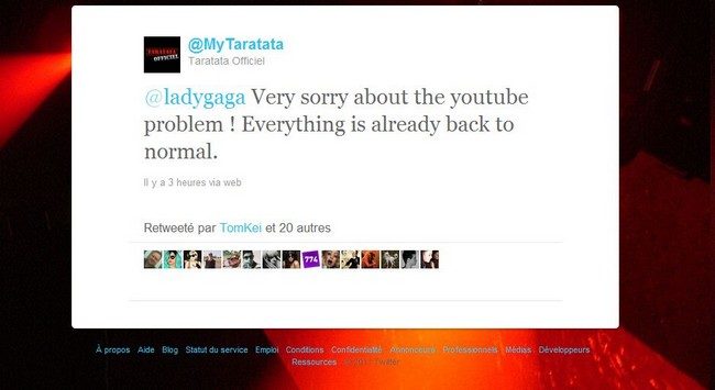Lady Gaga se souviendra de son passage dans Taratata. La chaîne officielle de la chanteuse sur YouTube a été fermée au motif qu’elle enfreignait le droit d’auteur de la maison de production de Nagui. Les personnes qui se connectaient sur le compte de la star ont eu la désagréable surprise d’y lire : « Le compte YouTube officiel de Lady Gaga a été désactivé car nous avons reçu de multiples plaintes pour infraction au copyright dont celles d’Air Productions. »
