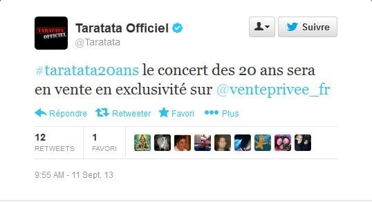 De son côté, le site vente-privee.com proposera à la vente exclusive à partir du 13 septembre les places pour le grand concert au Zénith de Paris le 10 octobre pour les 20 ans de Taratata. Ce concert sera également retransmis en direct dans des salles de cinéma Pathé. Ses 13 millions de membres auront également la possibilité de voir en avant-première la première émission de la nouvelle saison, le 17 octobre donc. Taratata et Vente-privee.com lancent également un concours de jeunes talents au Théâtre de Paris, propriété du site de vente en ligne.