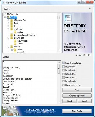 Directory List and Print vous permet d’établir une liste de toutes les données stockées sur vos périphériques. Sélectionnez simplement un dossier, un disque, un lecteur ou une clé USB et le logiciel répertorie automatiquement l’ensemble des répertoires, sous-dossiers et fichiers qu’il/elle contient. Il affiche également la taille de chaque élément, son nom, son extension, son chemin ainsi que la date et l’heure de sa dernière modification. La liste ainsi créée peut être imprimée, copiée dans le presse-papier ou sauvegardé sous Word ou Excel.