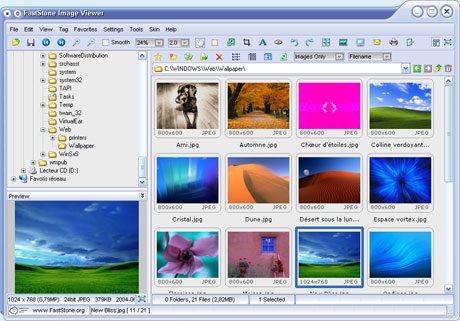 Grâce à son interface conviviale de type explorateur et à l’affichage de l’aperçu de l’image sélectionnée, FastStone Image Viewer vous permet de visionner rapidement vos images et photos. De plus, à l’aide d’outils intégrés, vous pourrez effectuer des actions sur les fichiers sélectionnés (redimensionner, modifier la luminosité, convertir, rogner, filtrer les yeux rouges, envoyer par e-mail, imprimer, etc.). Le logiciel prend en charge les types de fichier image les plus courants (BMP, JPEG, GIF, PNG, PCX, TIFF, WMF, ICO, etc.) ainsi que certains fichiers RAW. Le logiciel sait également gérer la présence d’un deuxième écran : il affiche alors les miniatures sur l’un et les images en plein écran sur l’autre.