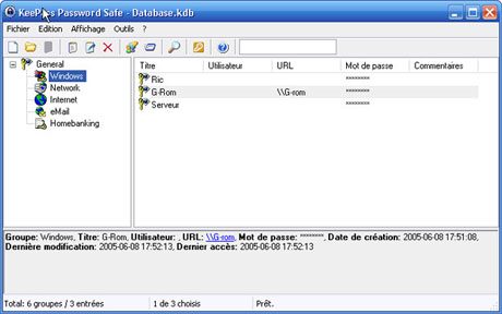 KeePass permet de rassembler l’ensemble de vos numéros de série, logins, mots de passe et autres numéros de comptes dans une seule interface. Vous n’aurez plus qu’à retenir un seul mot de passe, celui de la base de données du logiciel ! Il est également possible de générer une clé à copier sur un support amovible afin d’empêcher la lecture de la base si le mot de passe est volé.