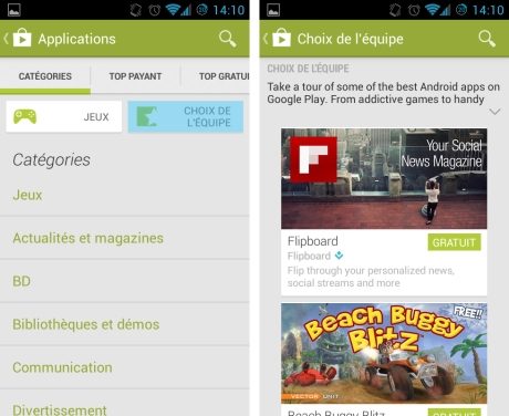 800 000 applications, c’est ce que le Google Play Store vous propose au travers de son application. Cette dernière mouture vous propose des achats In-App (dans l’application) mieux pensés de façon à ne plus sortir de l’application en cours d’utilisation. Les processus d’achat et d’installation sont simplifiés pour éviter les multiples clics et l’interface revue et corrigée apporte une meilleure prise en charge de l’affichage sur tablette.