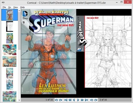 Comical est un lecteur de bandes dessinées aux formats CBR ou CBZ. Il propose plusieurs modes d’affichage (fenêtre ou plein écran, un ou deux pages visibles, etc.) ainsi que des options de rotation, de sens de lecture et de zoom. Son interface reste simple et fonctionnelle.